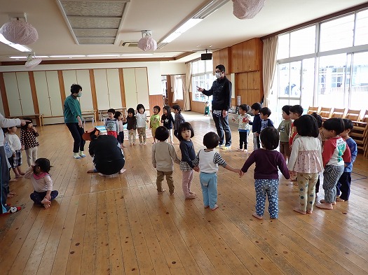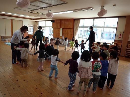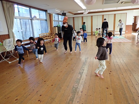 2023年11月15日 むっくりくまさん 2歳児 にじ ♪むっくりくまさん むっくりくまさん あなのなか~♪ ♪ねむっているよ ぐーぐー ねごとをいって むにゃむにゃ♪ ♪めをさましたら めをさましたら たべられちゃうぞ~♪ 「くーまーさーん」 寝ていたくまさんが起きたぞ!!逃げろ~! キャー! こどもたちは捕まらないように逃げるのですが、くまさんはこどもたちみんな捕まえます。 追いかけっこ楽しいね♪ 一覧へ戻る