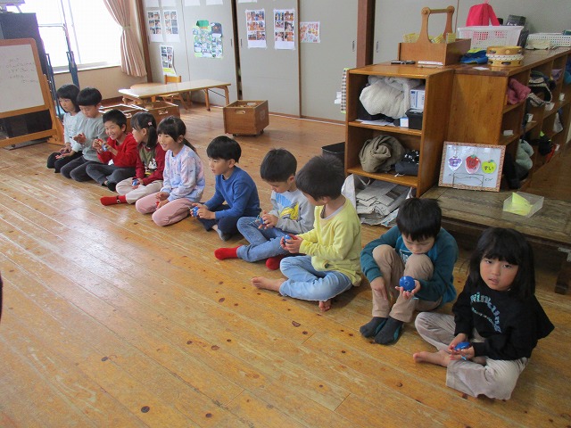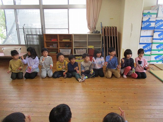 保育者が楽器の持ち方を伝えると上手に持ちます。