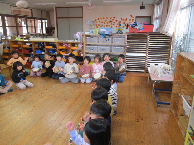 鈴やタンバリン、カスタネットを使って、楽器あそびを楽しみました。