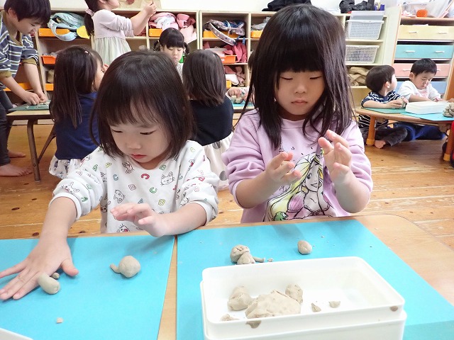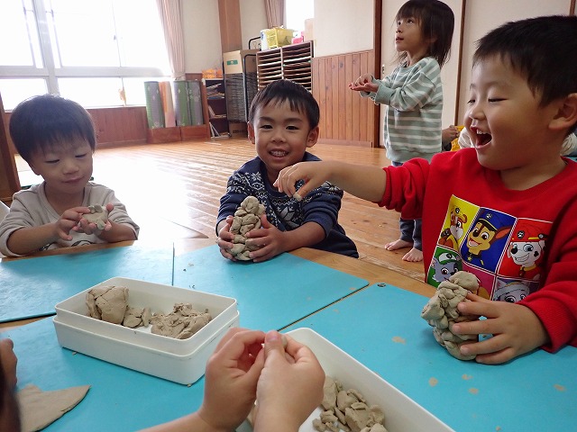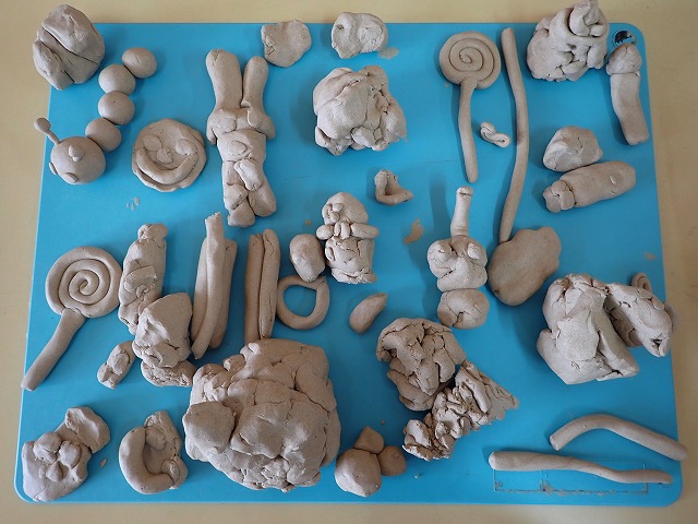 2023年11月17日 粘土 3歳児 つき 粘土をしました。 真剣な表情で思い思いのものを作っていくこどもたち。 「オラフ」「ピクミン」「ホットドッグ」など、たくさんの面白くてかわいいものが完成しました。 写真から何を作っているかわかりますか? 一覧へ戻る
