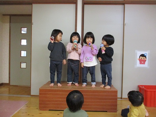 2023年11月17日 にじ組コンサート♪ 2歳児 にじ ほし組にあるマイクをお借りしました。 ほし組にきょうだいのいる子や、ほし組の部屋に遊びに行ったことのある子は見慣れていたようで、マイクを手に取り、ルンルンでうたっていました。 それを見て、「これはマイクだ!」と気づいてからは、いろんな子が次々に歌って楽しんでいました。 にじ組のマイクも作ろうかな~♪ この時はアンパンマンの合唱でした♪ 一覧へ戻る