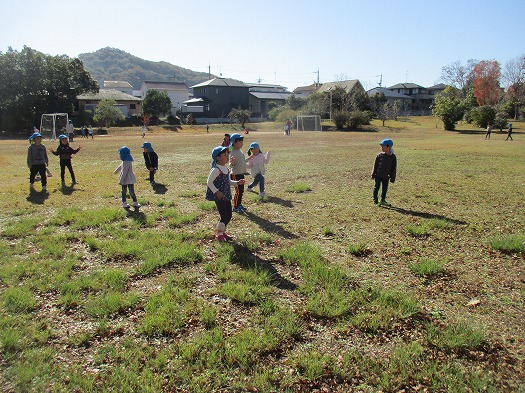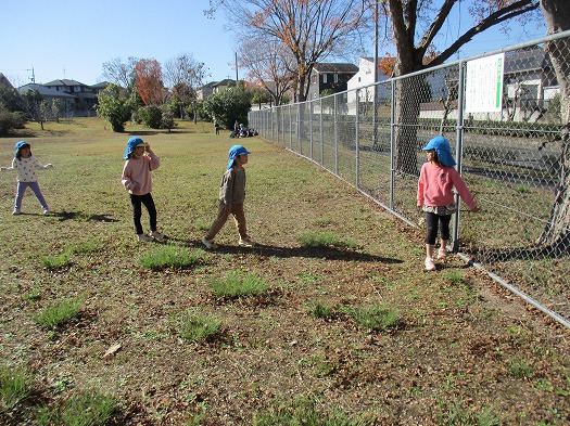 2023年11月21日 健脚活動 5歳児 そら 東二丁目のグラウンドまで行きました。 グラウンドではしっぽ取りをしました。 しっぽを取られないように周りを見たり、友だちのしっぽを取るために追いかけたり。 その後はだるまさんがころんだを楽しみました。 ピタッと止まり、タッチするところまで走ったり。 弁当の用意ありがとうございました。 一覧へ戻る