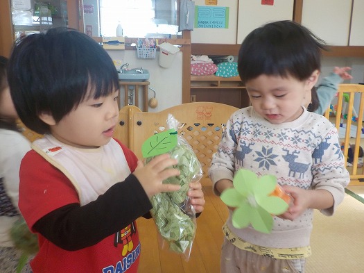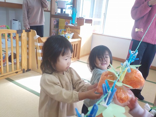 柿やマスカットを製作したものを紐につるして果物狩りをしました。