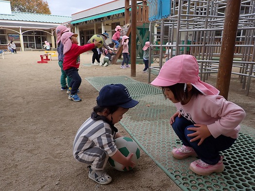 2023年11月25日 サッカーボール 0歳児 はな 3歳児 つき 戸外遊びをしていて、ボールを転がしていると一緒に「 遊ぼ―! 」 と誘われるとニヤリとしながらボールを転がしたり蹴ったりして楽しそうに 遊ぶ2人でした! 一覧へ戻る