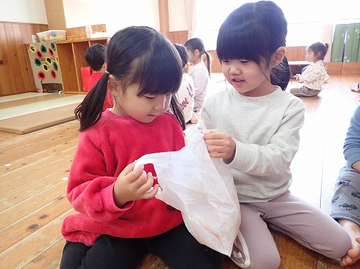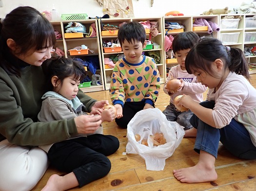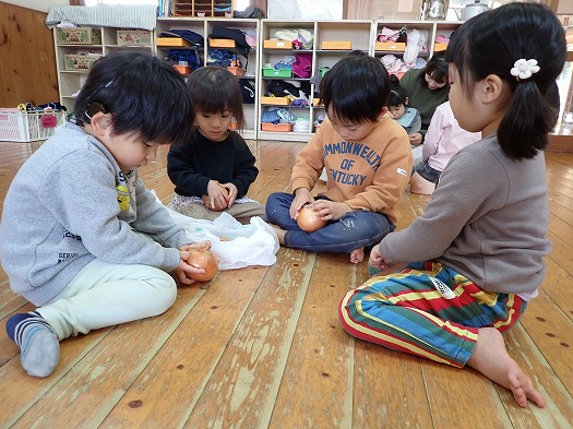 2023年12月13日 玉ねぎの皮むき 3歳児 つき 玉ねぎの皮むきをしました。 最初に剥き方を伝えると真剣な表情で傷がつかないようにやさしく剥いていくこどもたち。 「みてー」「こんなかんじ?」などと剥き終えるとニコニコで見せてくれました。 剥き終わった後の手や皮を匂っている子もおり、「りんごのにおいがする」「かきのにおいがする」などそれぞれ違った匂いがしたみたいです。 一覧へ戻る