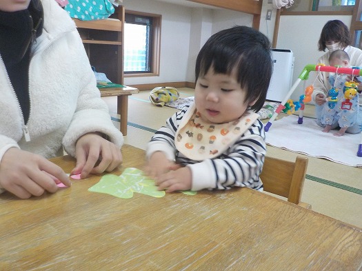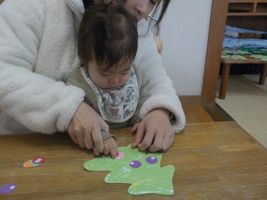 2023年12月13日 シールぺたぺた 0歳児 はな 12月の製作をしました。クリスマスツリーにシールをたくさん貼って、とてもカラフルなツリーができました! シール貼りが楽しくて、たくさん貼ったり、自分の好きな色を選んで貼ったりと、指先が器用になってきて、シール貼りがとても上手になっています。 これからもいっぱいシール貼りをしようね! 一覧へ戻る