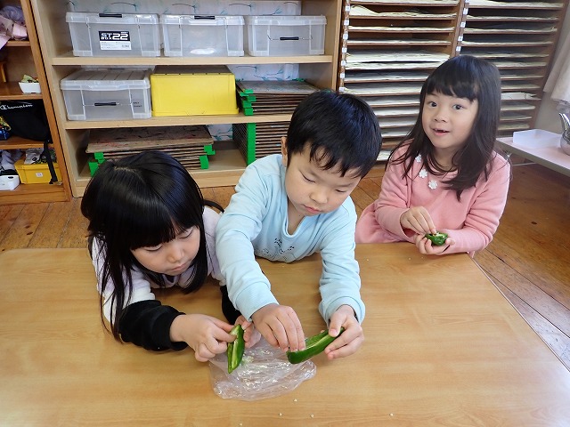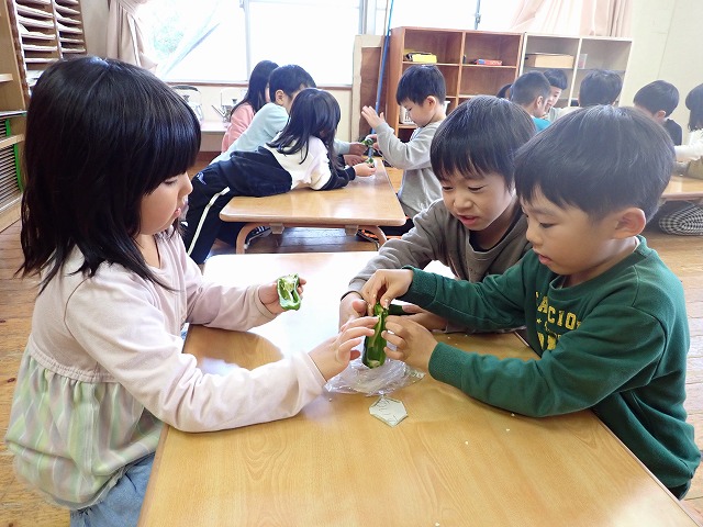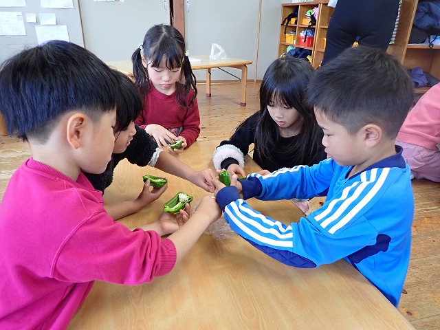 2023年12月11日 〇〇の種取り 5歳児 そら ピーマンの種取りをしました。 初めてのことですぐさま種取りを開始するそらぐみ。 種取りが難しい子は友だちと教え合ったり、保育者に聞いたり。 たくさんのピーマンがありましたが、みんな集中していました。 一覧へ戻る