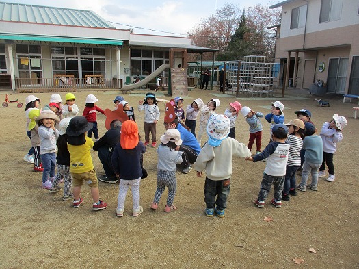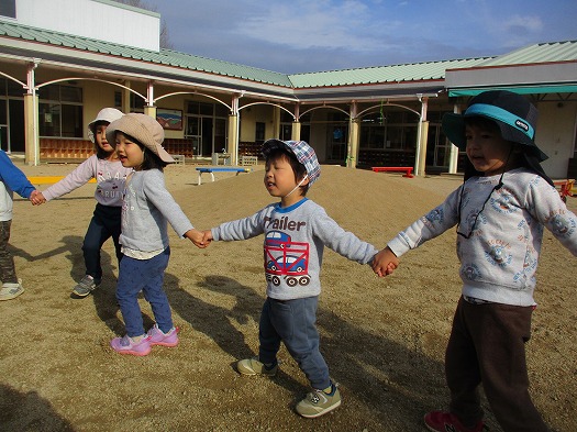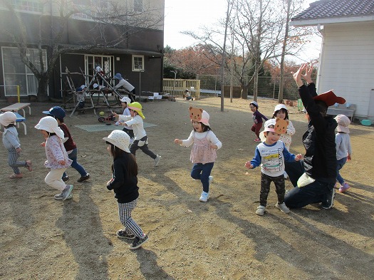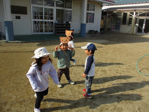 2023年12月11日 むっくりくまさん 2歳児 にじ 「せんせー!もっこりくまさんしよ!」 最近ブームのむっくりくまさん。「むっくり」を「もっこり」と言っている子が多いのが、保育者たちはちょっぴり面白いのですが、「よーし!くまさんしよっか!」と、クマのお面を出すと、こどもたちは大喜び。 ルールもすっかり覚え、楽しんでいます。 一覧へ戻る