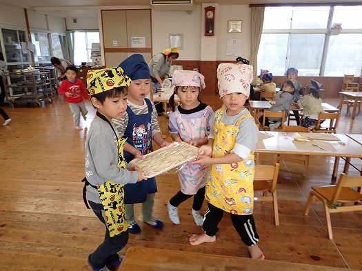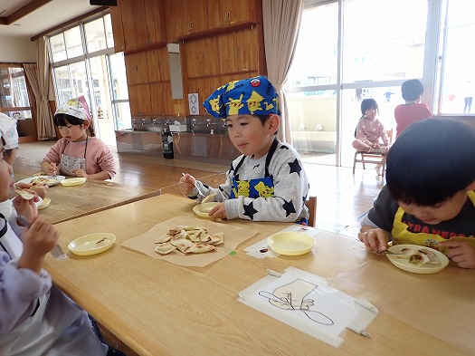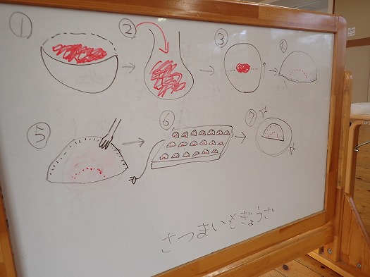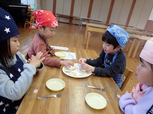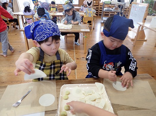 2023年12月15日 さつまいも餃子 4歳児 ほし 今日はエプロンや三角巾の準備ありがとうございました 作る途中、ほし組恒例(?)の味見タイムをして、みんなで150個のさつまいも餃子を作りました インスタにのっている感じのような撮影 一覧へ戻る