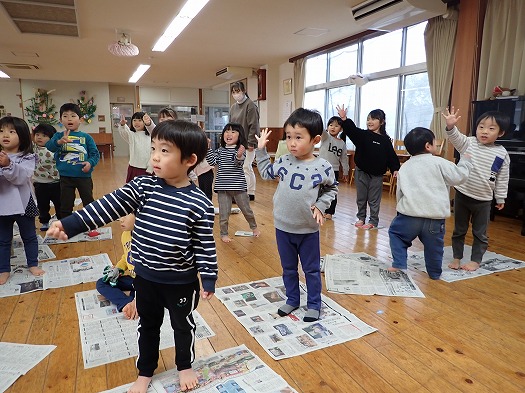 2023年12月20日 ふれあいあそび 3歳児 つき 4歳児 ほし つき組とほし組でふれあいあそびをしました。 「さいしょはぐー じゃんけんぽい!」と大きな声でじゃんけんをするこどもたち。 勝つと新聞を折っていき、小さくなると片足でバランスをとりながら頑張っていました。 つき組もほし組もみんな笑顔で楽しみました。 一覧へ戻る