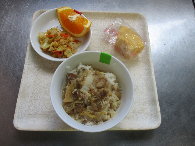 2024年01月10日 給食室(1月4日の給食、おやつ) 給食室 昼食 ・中華丼 ・コーンサラダ ・オレンジ おやつ ・バームクーヘン ・牛乳 明けましておめでとうございます。 今年も美味しい給食を作っていきたいと思います。 よろしくお願いします。 今日は、白菜、たっぷりの『中華丼』でした。 休み明けではありますが、よく食べていました。 一覧へ戻る