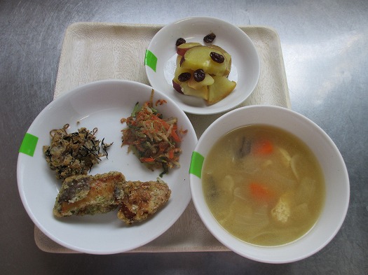 2024年01月13日 給食室(1月10日の給食、おやつ) 給食室 昼食 ・ごはん ・魚の磯辺揚げ ・卯の花 ・水菜とあみえびの和え物 ・花切大根のみそ汁 おやつ ・りんごとさつまいもの重ね煮 『魚の磯辺揚げ』片栗粉をつけて揚げているので、 かみかみメニューになっています。 醬油としょうがの味付けに、 衣の青のりの風味がついていてよく食べていました。 おやつの『りんごとさつまいもの重ね煮』は、 旬の食材のりんごが入ったシンプルな煮物です。 りんごとさつまいもとレーズンに砂糖を入れて、 電子レンジでもできるので、 作ってみてください。 一覧へ戻る