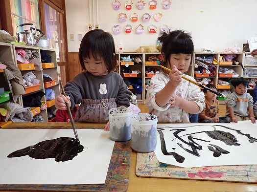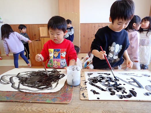 2024年01月15日 書初め 3歳児 つき とんどではやすために書初めをしました。 今回は墨ではなく黒の絵の具と筆で行ったのですが、それぞれが思い思いに描いている姿がみられました。 動物の絵を描いている子、ひらがなを書いてみる子など、素敵な書初めが完成しました。 自分たちが書いた書初めをはやす際にはみんなで「元気に過ごせますように」とお願いしました。 一覧へ戻る