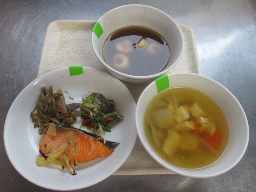 2024年01月31日 給食室(1月31日の給食、おやつ) 給食室 昼食 ・ごはん ・鮭のちゃんちゃん焼き ・きんぴらごぼう ・水菜の梅のおかか和え ・かみなり汁 おやつ ・ぜんざい 『きんぴらごぼう』は、かみかみメニューです。 『水菜の梅おかか和え』の水菜が旬の食材でした。 梅干しを刻んで和えています。 おやつの『ぜんざい』は、 白玉団子を作るのに、 豆腐を入れ作っています。 一覧へ戻る
