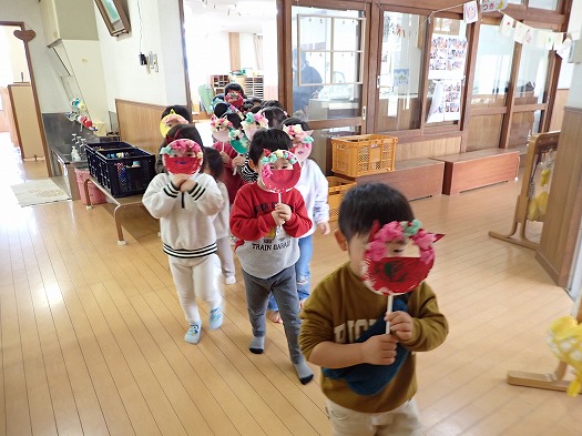 製作した鬼のお面をつけて、つき組が、にじ組の部屋に散歩に行きました。