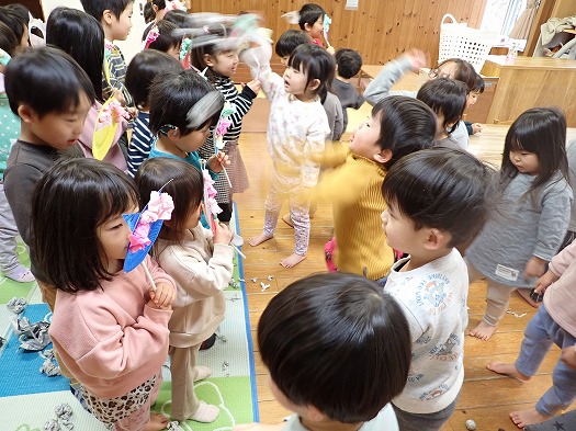 にじ組さんに新聞紙で作った豆を投げられると「ぎゃー」と言うなど、鬼になりきっている姿もみられました。