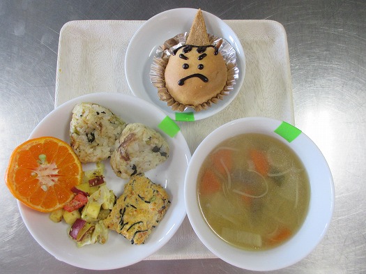★小鬼カップケーキ・・・カップケーキ1つ1つに鬼の顔をココアアイシングで描いています。角はクッキーで表現しました。「かわいい~!」と、とても喜んでいました。