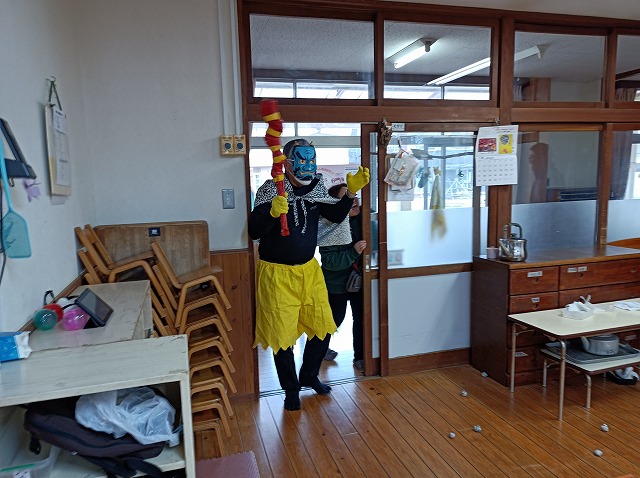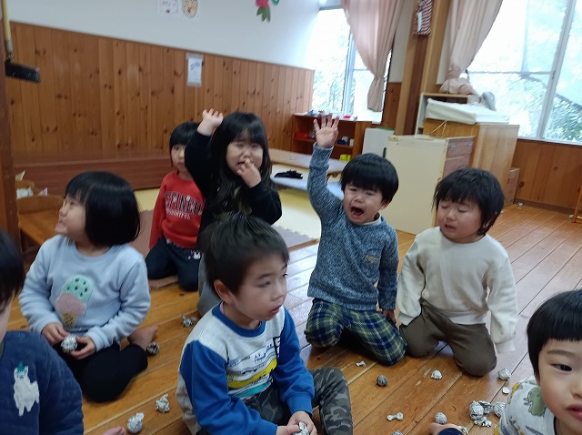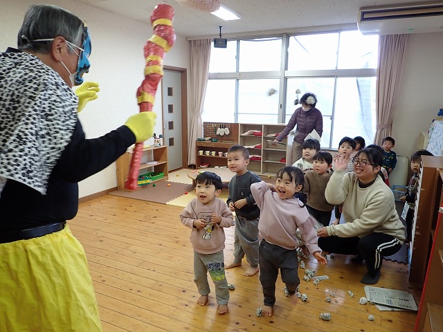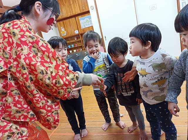 2024年02月02日 節分 2歳児 にじ もうすぐ節分。保育園にも鬼が来ました。 おにがきたぞ~! 「おには~そと!」 「怖かった人~?」 「は~い…」 福の神様に、福豆の代わりのポン菓子をもらいました。 今年も元気に過ごせますように…。 一覧へ戻る