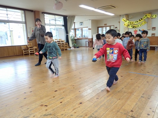 2024年02月09日 ボール運びリレー 3歳児 つき ボール運びリレーをしました。 「お玉にボールをのせ、落ちないように運ぶ」これがなかなか難しい…。 ボールが落ちそうになるとつい手で押さえているのですが、チームのみんなで協力して頑張っていました。 次の順番の子のお玉に、やさしくボールを置いたり、頑張っている友だちを応援したりと、チームワークも芽生えていました。 一覧へ戻る