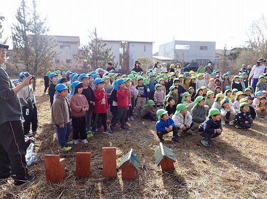 2024年02月10日 巣箱設置 4歳児 ほし わくわくの森へ行って、巣箱をとりつけてきました 系列の保育園、こども園のこどもたちも集まり総勢110名ぐらいのこどもたちがわくわくの森へ集まりました 自分たちが選んだ木と巣箱。いまちょうど(実はちょっと遅いのですが)、巣を探している鳥がこどもたちが選んだ巣箱に巣を作ってくれるだろうか。これからが楽しみです みんなでつくるわくわくの森をどうぞよろしくお願いします いつでも遊びに行ってみてくださいね 一覧へ戻る