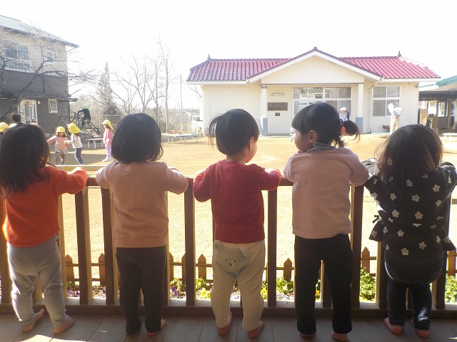 外で遊んでいるお兄ちゃん、お姉ちゃんをテラスから眺めました。