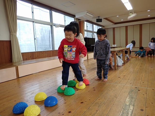 トゲトゲのクッションでは「いたいよー」と言っている子、平気そうにスイスイ進んでいる子と、こどもたち一人ひとりによって反応は違いました。