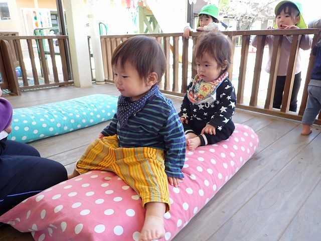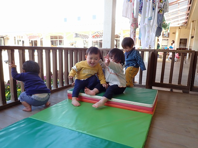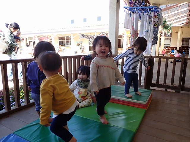 2024年04月15日 マットあそび 1歳児 ゆき テラスで遊ぶのが気持ちのいい季節。 クッションマットやマットを使って遊びました! 身体を動かすのが大好きなゆきぐみは大喜びでした♪ 保育者が「バスに乗って揺られてる」を歌うと、自然と揺れる身体♪ マットにジャンプ台を作ると、両足ジャンプを楽しむこどもたち。 ぴょんと飛び降りて着地できると、顔を見合わせて笑っていました! 可愛い姿でした。 マット、ふかふかで気持ちいいなぁ♪ 尻もちついても面白くて笑っちゃう! 一覧へ戻る