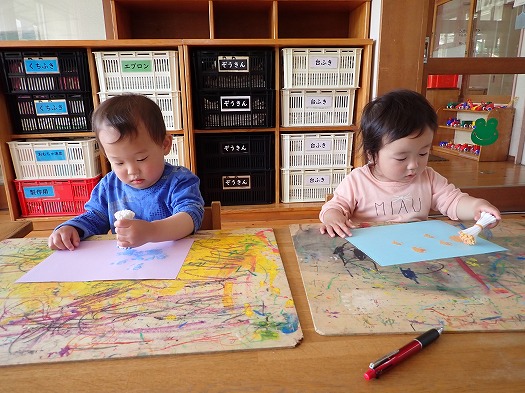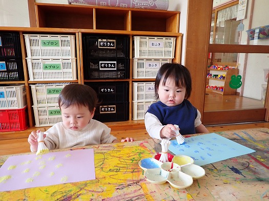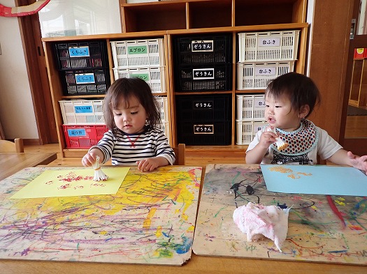 綿棒でついた不思議な模様や、絵の具に興味津々のこどもたちでした。