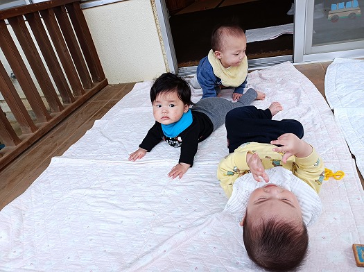 2024年04月19日 日向ぼっこ 0歳児 はな 天気がよかったのではな組テラスで日向ぼっこをしました。 テラスでヒラヒラしているこいのぼりをみたり、ポカポカ温かくてウトウト眠たそうにしたりする姿がみられました。 一覧へ戻る