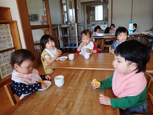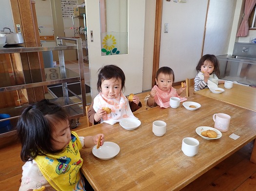 2024年04月27日 おいしいね。 1歳児 ゆき おやつの時間が大好きなこどもたち。 あそびに夢中だった子も、「おやつ食べるよ~」と声をかけると ささっとおもちゃを片付けて、手洗いを済ませ、椅子に座ってスタンバイです。 サクサクのクッキー美味しい♪ このクッキー何が入っているのかな? 何が入っているのかな?どんな味がするかな? メニューについて話しながら、一緒に食べる時間が、私たちにとっても幸せなひと時です。 ちなみに、今日のおやつは「にんじんクッキー」でした。 一覧へ戻る