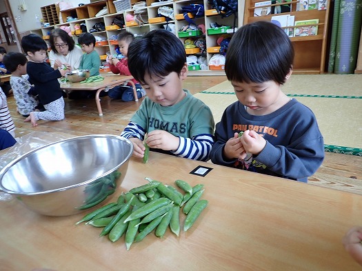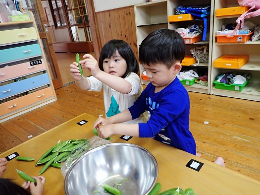 2024年05月13日 グリンピースの皮むき 3歳児 つき 給食室の手伝いで、グリンピースの皮むきをました。 最初は上手くむけず「できない」「どうやってやるの?」と保育者に助けを求めるなど苦戦している姿も多かったです。それでも、 何個も諦めずに剥こうとしたり、むくのが上手な友だちを見て真似してむいてみたりしているうちに、 少しずつコツをつかんで、むけるようになっていました。 みんなでむいたグリンピースが、給食に出てくると、グリンピースが苦手な子も一粒は食べてみようとする姿も…。 「自分が手伝った」というパワーはすごいなぁと実感しました。 一覧へ戻る