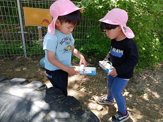 園庭で見つけた好きな物を、何でも入れれる嬉しいマイバッグ。