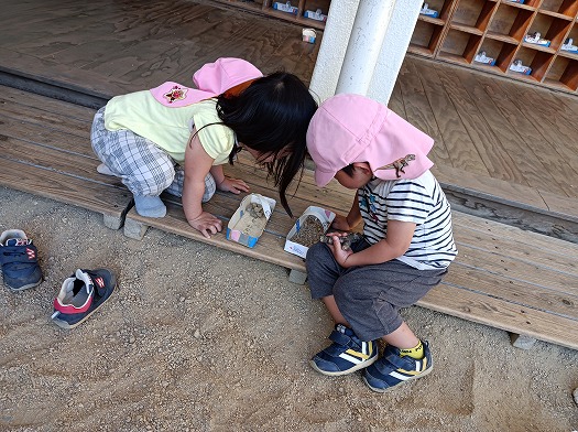 どろ団子や、木の実、木の棒、小石、ダンゴムシ、蟻、何かわからない虫…。いろんな物(虫?)が入っています。