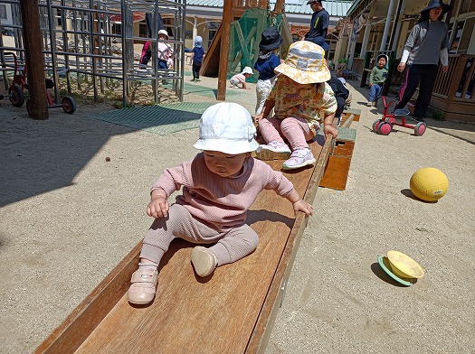 戸外に低めの滑り台を設置すると、嬉しそうに寄ってくるこどもたち。