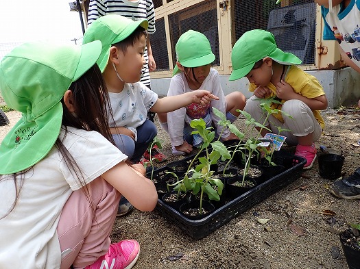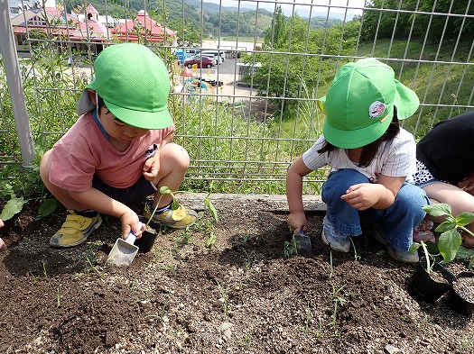 2024年05月23日 ひまわりの植え替え 4歳児 ほし ひまわりの芽が大きくなったので、植え替えをしました。 土が固くて深く掘ることが難しかったようですが、ポットが入る深さまで掘ろうと諦めずに掘り続けていました。 ポットから取り出す時に「どうするの?」という声がたくさん聞こえたり、芽が抜けてしまうというハプニングがあったりしました。 しかし、植え替え中に土が崩れないようにと真剣な表情をしていました。 無事に全てのひまわりの芽を植え替えることができました。 一覧へ戻る
