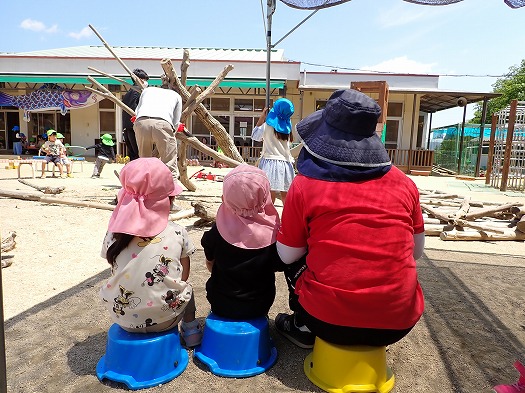 学童の職員が、園庭の木を組み合わせて、登れるようにしてくれています。