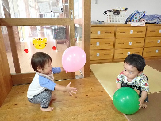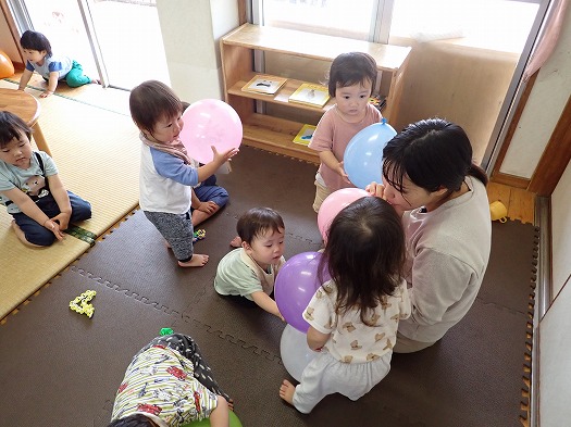2024年05月27日 カラフル風船♪ 1歳児 ゆき 外は雨模様。 ゆきぐみの部屋では、風船パーティーが開催されました! 保育者が膨らませる風船に興味津々のこどもたち。 ポンッと投げると、顔より大きな風船を拾って抱え、嬉しそうに笑っていました♪ 大きな風船楽しいな! 風船を膨らませる様子を不思議そうに眺める子や、風船が欲しくて急かすように手を伸ばす子で、保育者の周りにはこどもたちがいっぱい! 早く早く、もっともっと~! 雨の日、室内でも楽しいを発見し、笑う声に溢れるゆきぐみでした! 一覧へ戻る