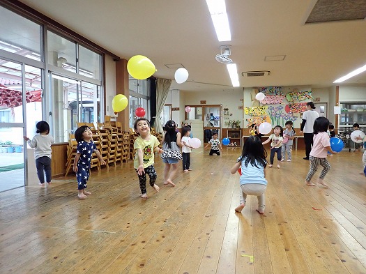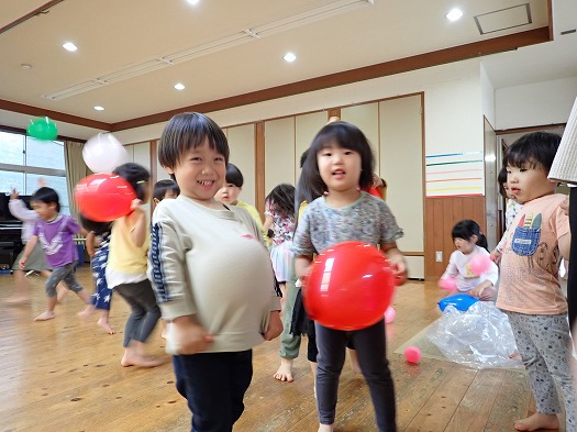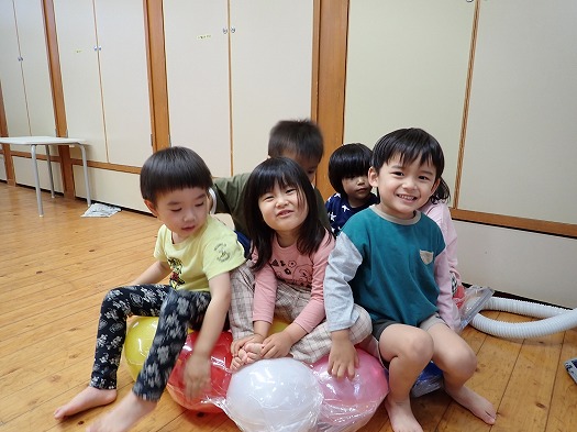 2024年06月01日 ふうせん🎈 3歳児 つき 進級会の時に、園長先生からもらっていた風船で遊びました。 ポンポンと手で打ち上げたり、蹴ったり、転がしたり、楽しみ方は色々でしたが、どの子もみんないい笑顔で転がっていく風船を追いかけていました。 しばらく遊んだ後は、圧縮袋に入れて空気を抜いて… 風船クッションにしました。 一覧へ戻る