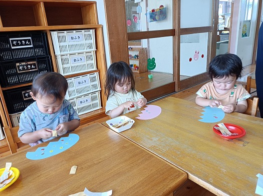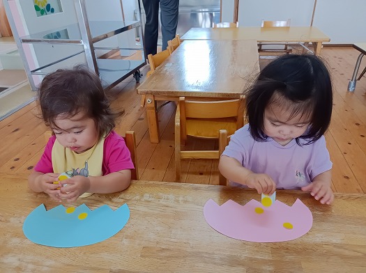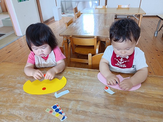 2024年06月06日 ペタペタ♪ 1歳児 ゆき 6月の製作でシール貼りに挑戦しました! はじめは台紙から剥がすのが難しかったようですが、 保育者と一緒にすることでやり方を知り、一人で剥がして貼れるようになってきました。 指先の繊細な動き、使い方が上手になっています♪ 台紙から剥がすのはなかなか難しいなぁ… この大きさのシールなら貼りやすいぞ! これは何になるのかな?? さて、このシールを貼った色画用紙は何になるでしょうか? それは部屋に飾ってからのお楽しみです! 一覧へ戻る