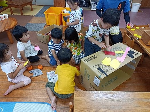2024年06月17日 みんなで作ろう 2歳児 にじ ビーチバックを入れるための段ボールをみんなでデコレーションしました。 初めてのりを使うので、初めに指一本でつけるんだよと説明をしました。真剣に保育者の方を見て聞いていた子どもたち、上手に指を使って塗ってみていました。 どんなものができたか楽しみにしていてくださいね! 一覧へ戻る