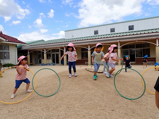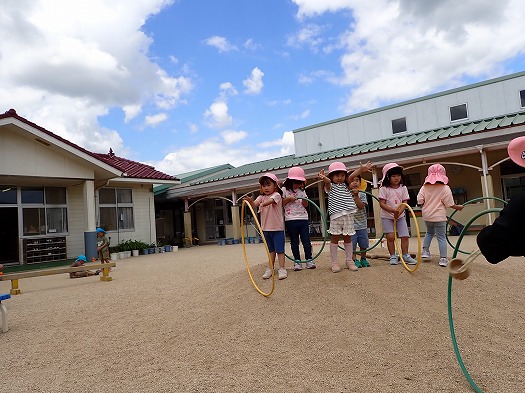 2024年06月12日 ころころころ~ 3歳児 つき 園庭の築山~フラフープを転がしては、走って取りに行く… これがなかなか面白い♪ 友だちと一緒で、面白さも倍増です! 用意はいいかい? フープまてまて~! 一覧へ戻る