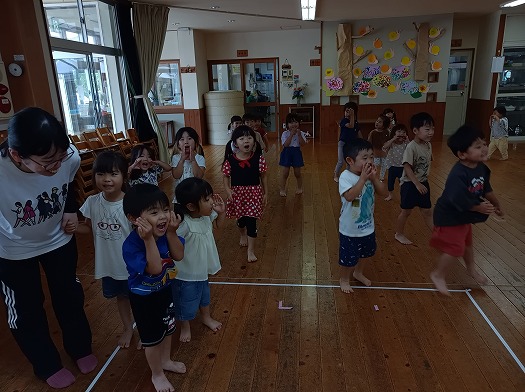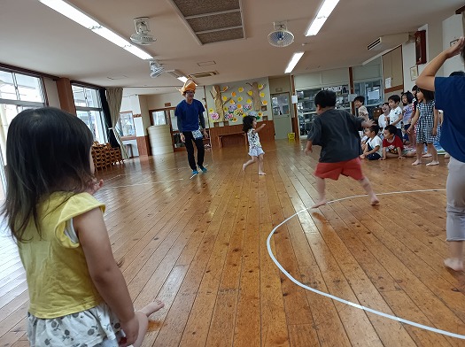 2024年06月28日 「おおかみさん」 2歳児 にじ 4歳児 ほし にじぐみとほしぐみで、一緒に「おおかみさん」のあそびをしました。 みんなで「おおかみさーん」と呼ぶと… 「おおかみさ~ん」 準備のできたオオカミさんがみんなを食べにやってきます! 食べられないように全力で走って逃げるこどもたちでした。 他の人とぶつからないように良く周りを見て走っていました! 一覧へ戻る