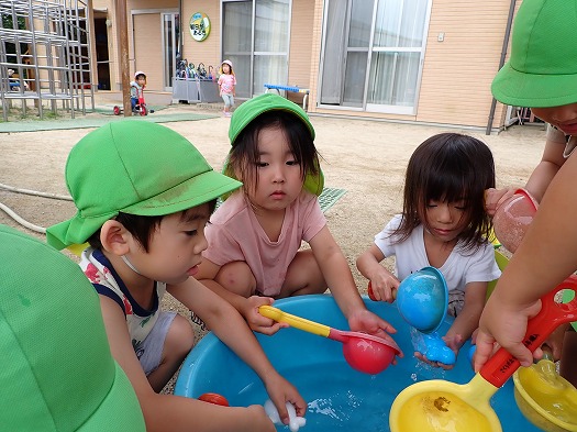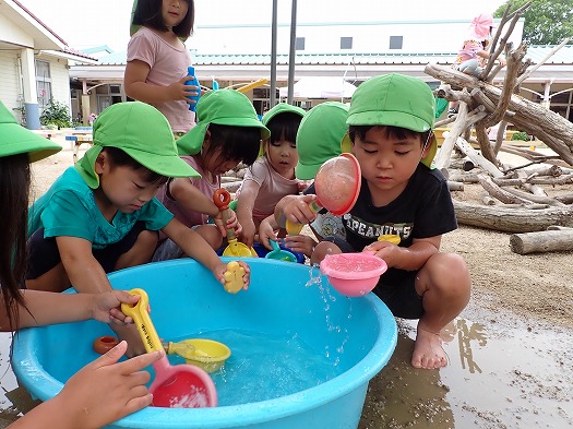 2024年06月29日 釣るぞ! 4歳児 ほし 今年度初めての水あそびをしました。 桶に水を入れてスコップですくったり、魚の玩具を入れたりして遊んでいました。 その遊びが発展していき、魚をスコップですくって「魚釣り~!」と楽しんで遊んでいる姿もみられました。 一覧へ戻る