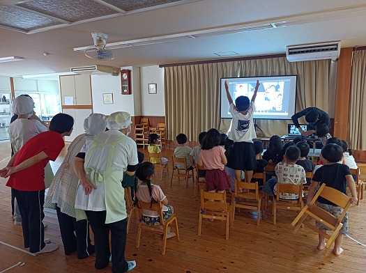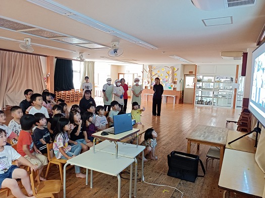 給食室で働いている仲間も、おやつ作りの手をいったんとめて、スクリーンをのぞいていました