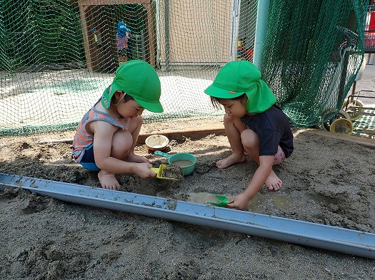 しばらくすると、泥団子を作ったり、鍋に水を入れておままごとをしたり、筒を組み合わせて水を流したりと、好きなあそびを楽しんでいました。