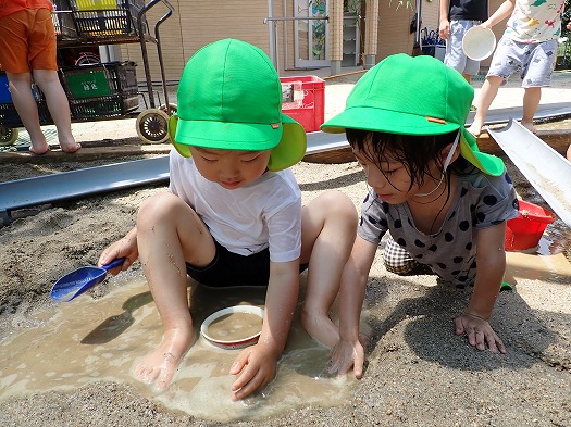 最初は保育者に水をかけられることが嬉しくて、「こっちも、こっちも!!」とかけてほしいアピールをたくさんしていました。