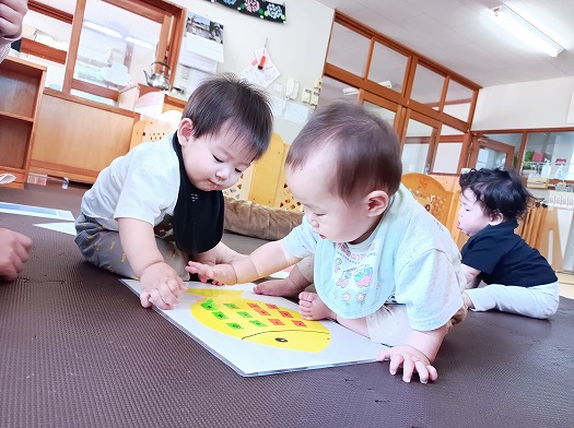 2024年07月05日 シールあそび 0歳児 はな シールに興味津々なこどもたち。 土台からはがせた後、手にくっついたシールをはがそうと一生懸命に手を振って自分の手からシールをはがそうとする姿が可愛かったです♪ 一覧へ戻る