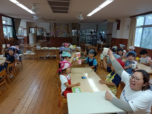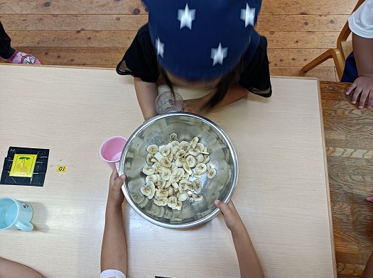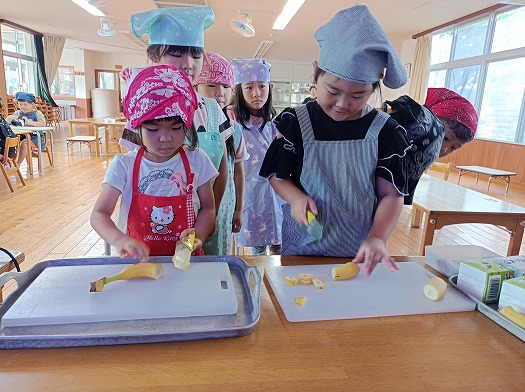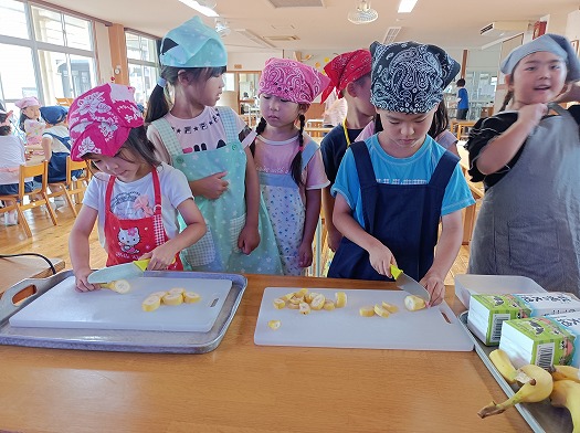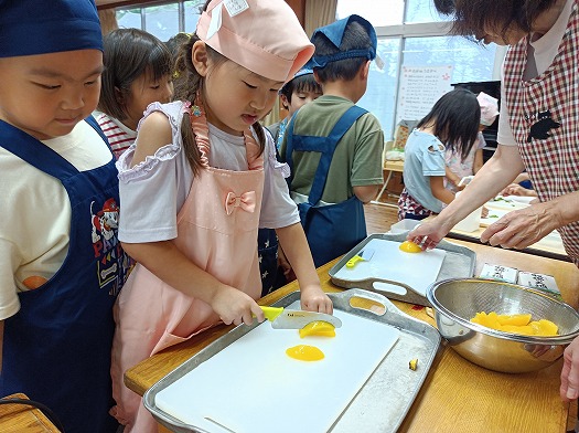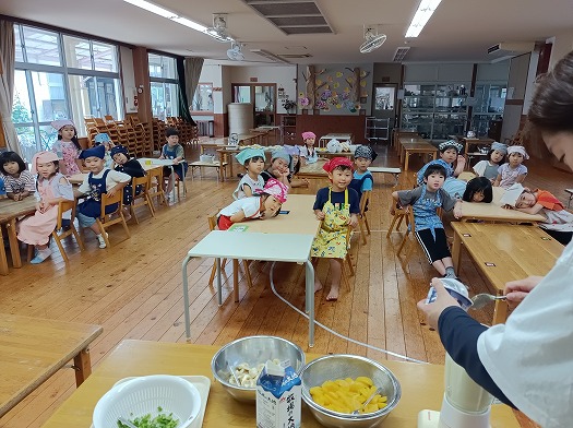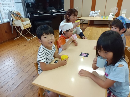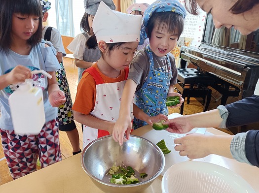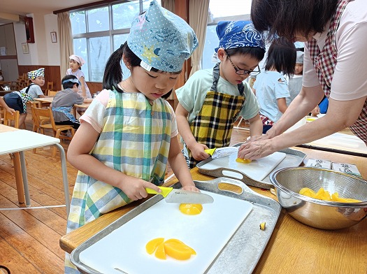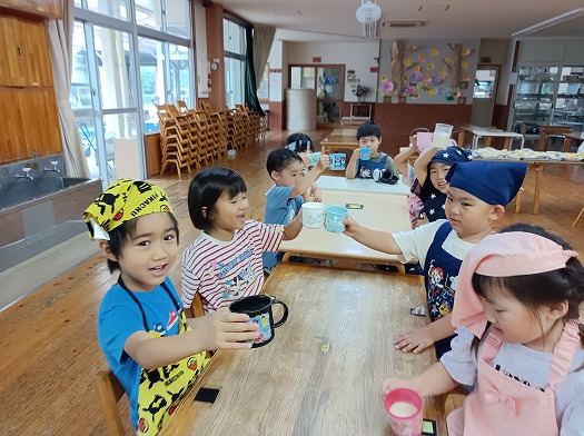 2024年07月15日 ピーマンジュース第二弾 5歳児 そら みんなで決きたピーマンジュース ○桃缶(今回はシロップも使用) ○牛乳 ○バナナ ○ピーマン それらをミキサーでぐるぐるをかき混ぜます 保育補助員の森さんや中塚さんも手伝ってくれ、包丁使いの大先輩からアドバイスと温かいまなざしがとどきました 一覧へ戻る