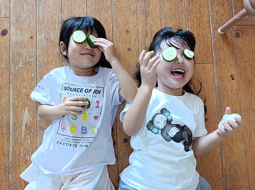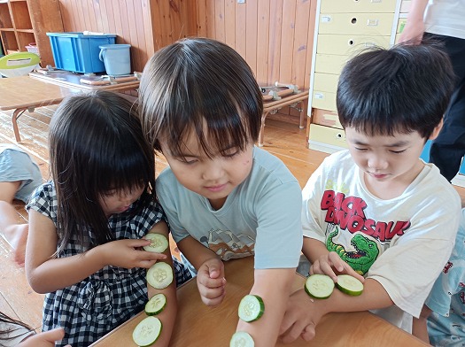 自分で輪切りにしたきゅうりを、腕や足の上に置くと「つめた~い」「気持ちいい」と言って冷たさを楽しんでいました。
