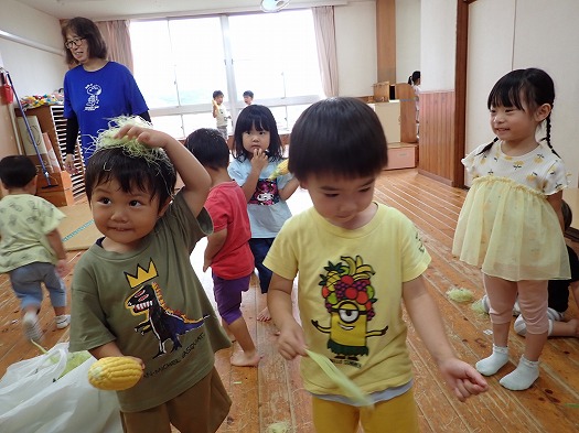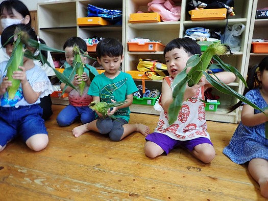 2024年07月18日 とうもろこしの皮をむこう! 3歳児 つき とうもろこしの皮むきをしました。 一人1個とうもろこしを渡されると「でっか!」と言いながら嬉しそう。 最初は「どうやってむくの?」と保育者に聞く姿もみられましたが、むき方を伝えるとひげの部分まで綺麗に取れていました。 皮むきが終わった後はひげであそびました。 頭の上にのせてみたり、雨のように上から降らせてみたりと、ニコニコで楽しんでいました。 次の日に給食に出たのですが、「これ昨日むいたやつだよ」と伝えるとおかわりしてたくさん食べていました。 お手伝いパワーすごいです! 一覧へ戻る